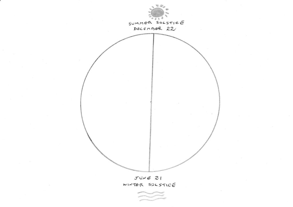 Let’s begin with this chart of the solstices where the midsummer solstice at the top represents the peak of summer, of the Fire Element and of the greatest yang. The midwinter solstice at the bottom represents the depth of winter, of the Water Element, and of the deepest yin.