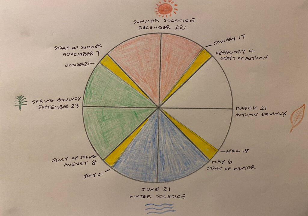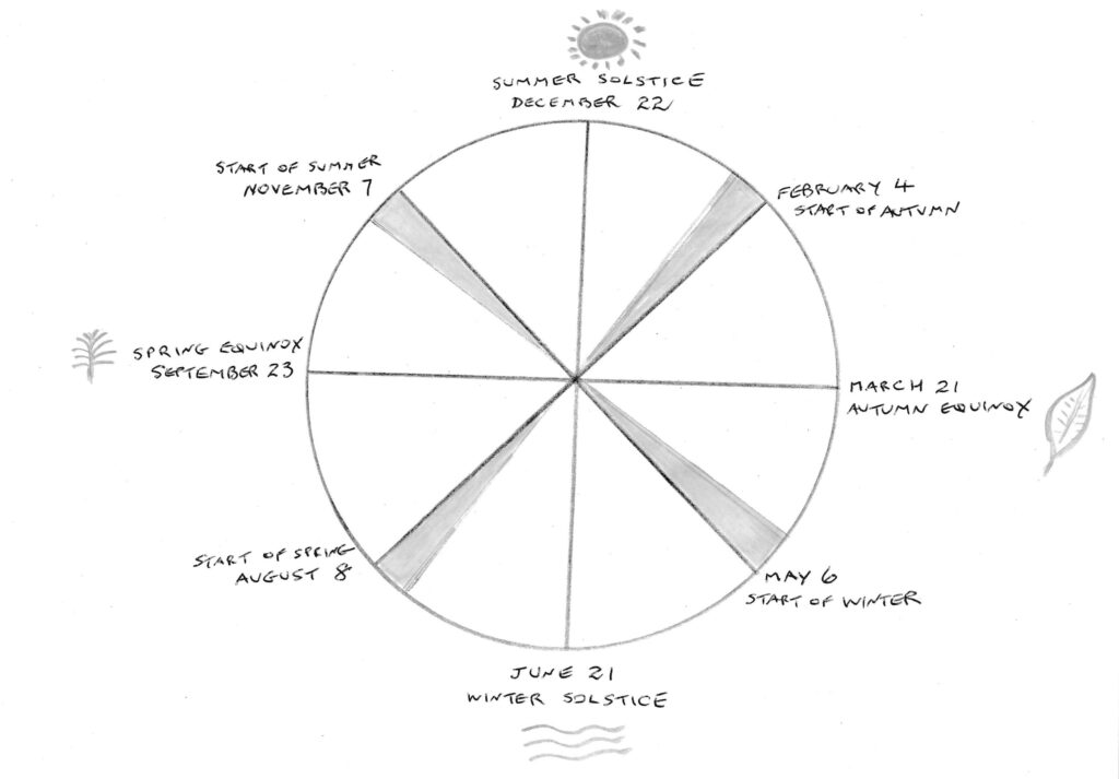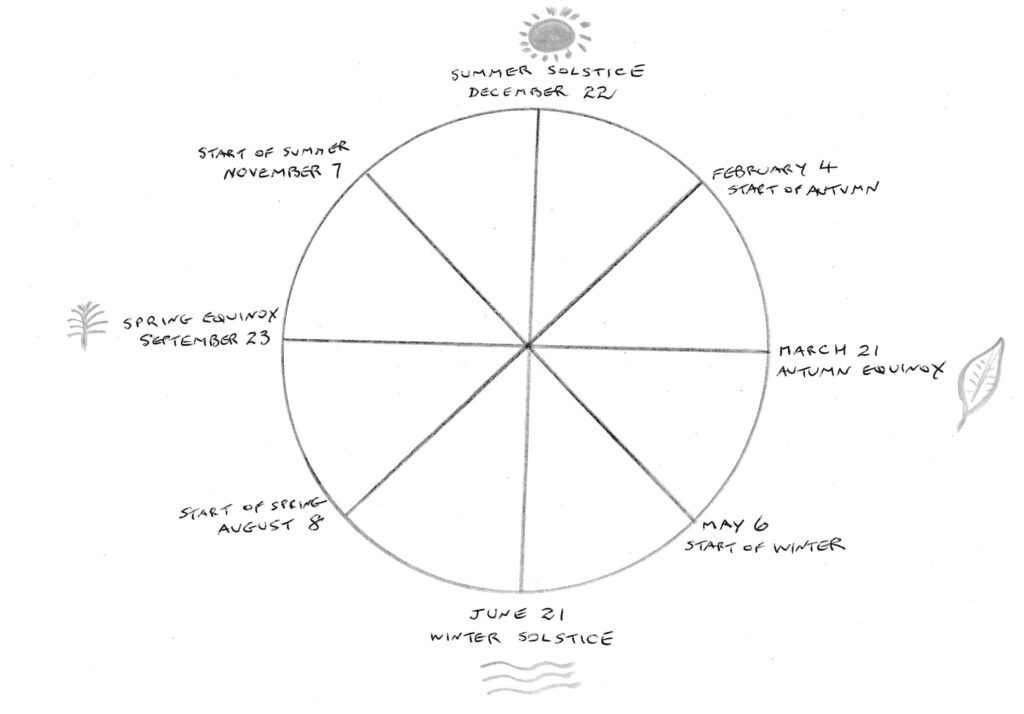 One of the questions I am asked most often is, “When do the seasons start?” Given that treatments are stronger when an Element is treated in its own season, it is important to know when each season begins. Here in Australia the spring is considered to begin on September 1st, summer on December 1st, autumn on March 1st and winter on June 1st.  Some sources suggest this is a historical convention because the soldiers who guarded the convicts in the early years of European settlement changed from winter to summer uniforms on December 1st and from summer to winter uniforms on June 1st.